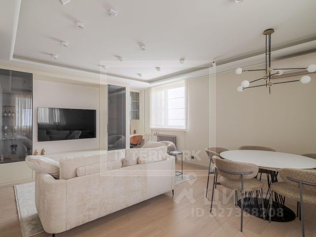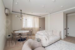 Уютная круглая гостиная (зал): Сердце квартиры с электрокамином (эффект живого огня), огромным раскладным диваном, полукруглым телевизором и аудиосистемой. Три окна: вид на ВТБ Арена и тихий двор.