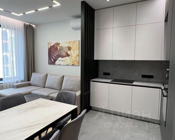 - Гостиная - совмещенная с кухней, полностью мебелирована, с большим телевизором 55 дюймов. Выход в застекленную лоджию с панорамными окнами.