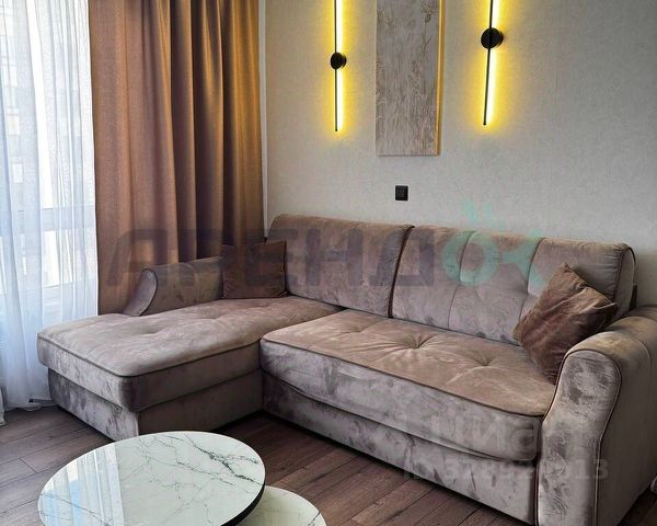 Гостиная расположена в центре квартиры и великолепно подходит для уютного семейного вечера или встреч с друзьями. Мягкий комфортный диван с раскладывающимся механизмом и тв-зона напротив - идеальный уголок для приятных встреч и общения, а рабочая зона с хорошим естественным светом позволит с комфортом организовать мини-офис в уютной домашней обстановке.