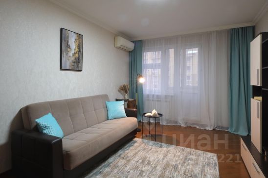 Гостиная: 2 трехместных раскладных дивана (с местом хранения), 2 журнальных столика, книжный шкаф, ТВ-зона, домофон. Балкон с сушкой для белья