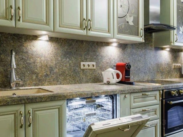 Кухня оснащена новой бытовой техникой: холодильник, духовой шкаф, варочная панель, микроволновая печь, посудомоечная машина, чайник, набор необходимой посуды и приборов, мусорное ведро и пр.