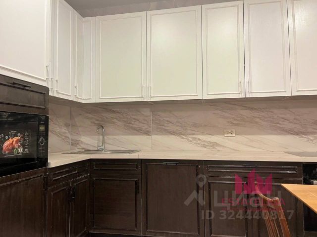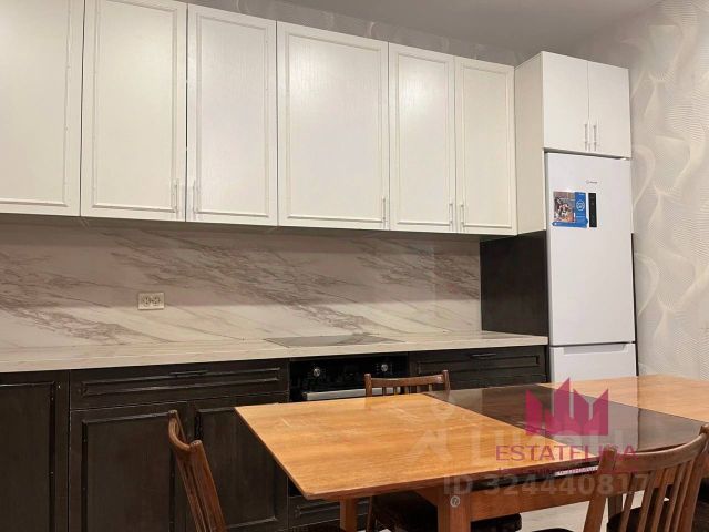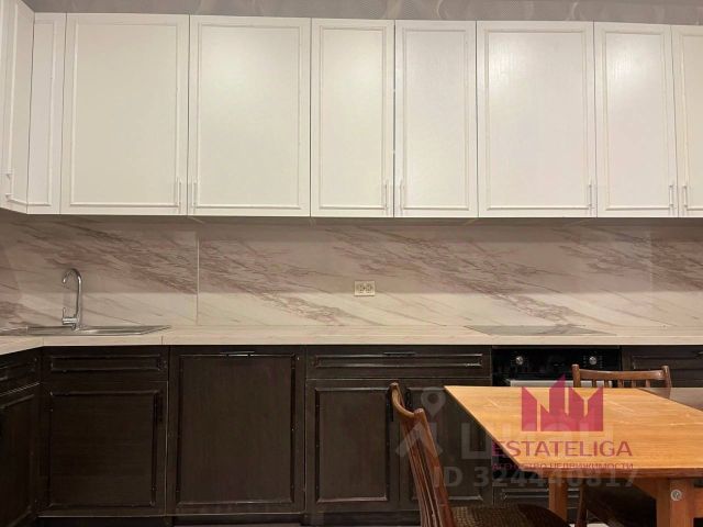 Кухня из натурального дерева. Большая каменная мойка, посудомоечная машинка Сименс. Холодильник Либхер. Газовые варочная панель и духовой шкаф. Тахта, на которой уютно смотреть телевизор. Большое окно, большой подоконник шириной 60 см и длиной 2 метра. Деревянный стеклопакет и деревянные жалюзи.