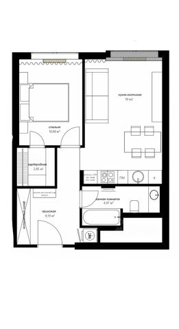 — просторная кухня-гостиная 27 м² с полностью оборудованной кухней;