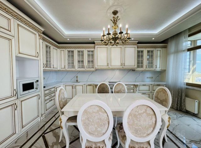 Соседство с МГУ — это привилегия двигаться в своём ритме: гулять в ботаническом саду на Ленинских горах, кататься на велосипеде по "Зелёному кольцу", наслаждаться тишиной района живописных долин, посольств и престижных учебных заведений. Эта квартира хранит то же интеллигентное спокойствие с ноткой избранности. За окнами свет касается университетского шпиля. Мрамор, оникс и кварцит играют фактурами и оттенками в первых лучах. А вы начинаете утро с авокадо-тостов и свежевыжатого сока в кругу семьи, прежде чем все начнут собираться на работу, спорт или учёбу. Гостиная — образец богемного вкуса. Натуральный камень, лепные карнизы и молдинги, латунные светильники и распашные двери задают торжественный тон. Дерево тёплого орехового оттенка, зелёная обивка кресел, бордовые шторы и ковёр в стиле бохо добавляют артистизма. Здесь вы собираете гостей за большим мраморным столом, чтобы сыграть в "Мафию" — игру, придуманную по соседству, в университете. Раскрываете двери — и оказываетесь на кухне. Белые филёнчатые фасады и сияние зелёного камня готовят к гастрономическим экспериментам. Здесь запекают лосось со спаржей и готовят шоколадный фондан — и подают в уютной столовой. В трёх спальнях — ритм мечтаний. Одна залита сиянием оникса, две другие — детские, созданные для того, чтобы грызть гранит науки с видом на университет, а по вечерам читать фэнтези. Ванные комнаты — продолжение игры камня и света: от графичных сочетаний тёмного гранита и светлого мрамора до нежных узоров и лепных карнизов. Здесь вы всегда на своей волне — и всё подстраивается под ваш ритм. Главное о квартире: третий этаж, 159 метров, гостиная, кухня со столовой, мастер-спальня с своей ванной и гардеробной, две детских, гостевой санузел, постирочная, гардеробная в прихожей. Техника Kuppersbusch. Виды во двор и на МГУ. Можно с детьми, а вот с домашними животными не получится. Главное о доме. "Квартал Шуваловский" — премиальный жилой комплекс из восьми корпусов переменной этажности. Архитектура опирается на классический силуэт МГУ: фасады в бежево-коричневых тонах из натурального камня, просторные лобби с мрамором и высокими потолками. Внутренние дворы закрыты и озеленены: аккуратные газоны, детские площадки и спортивная зона для тренировок. Для жителей работают супермаркеты, кафе и рестораны, СПА-центр, медицинский блок и даже школа с англоязычным уклоном и собственный детский сад. Автомобили можно оставить в подземном паркинге или на гостевой стоянке. Главное о локации. Комплекс стоит на пересечении Ломоносовского и Мичуринского проспектов, рядом с главным зданием МГУ и Ботаническим садом. До метро "Ломоносовский проспект" всего 2 минуты пешком, до станции "Раменки" — 5 минут. Утро можно начать с прогулки по аллеям ботсада или пробежки вдоль набережной Раменки. Вечером жители выбирают рестораны на Кутузовском или культурные события в ДК МГУ. Для семей поблизости гимназия 1448 и школы 1306 и 1586, а также детский сад 2523. Удобный выезд на ТТК и Ленинский проспект делает поездки в Снять 4-комнатную квартиру на проспекте Ломоносовский в Москве на длительный срок.