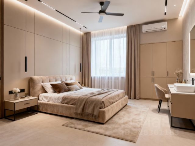 Спальня 1. с застекленной лоджией и системами хранения. Три уровня света. Свет по периметру регулируется с пульта. Шкаф, кровать двуспальная Vivent с системой хранения, две прикроватные тумбочки, шторы.