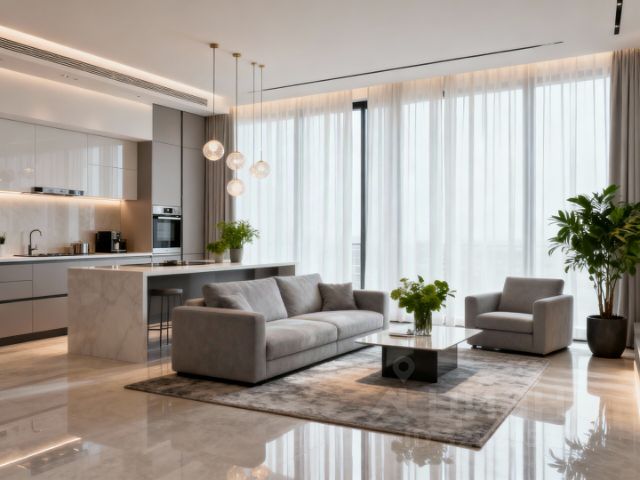 Давайте я проведу вас по этому пространству. Вы заходите в просторную прихожую, которая сразу задаёт тон: здесь всё серьёзно, но с душой. Дальше — огромная гостиная, объединённая с кухней. Представьте себе вечер, когда вы готовите ужин, а за огромным столом уже сидят ваши близкие. Кто-то пьёт чай, кто-то помогает нарезать салат, а кто-то просто наблюдает за огнями города за окном. Это то самое место, где рождаются тёплые воспоминания.