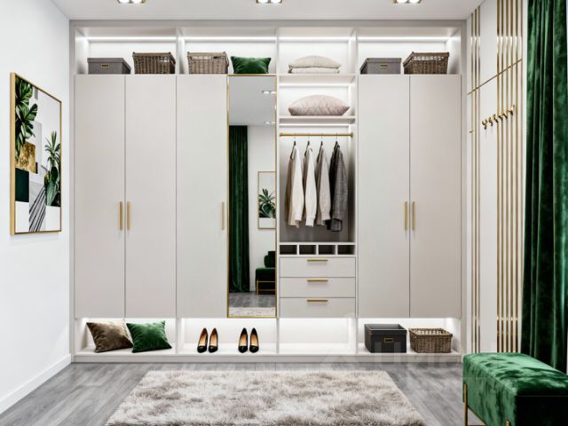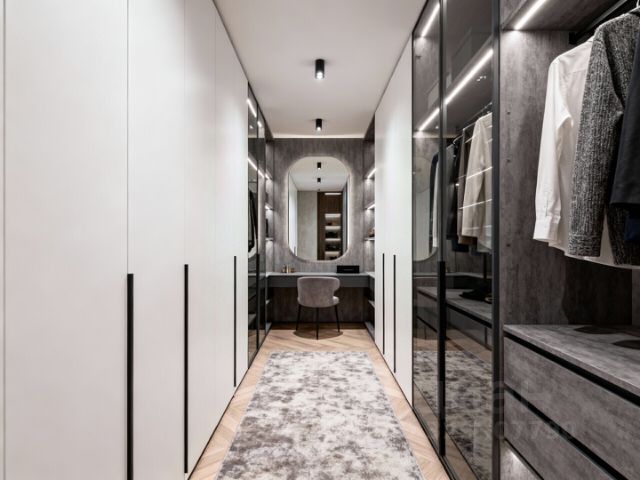 Просторный холл с зеркалом с подсветкой и встроенными шкафами