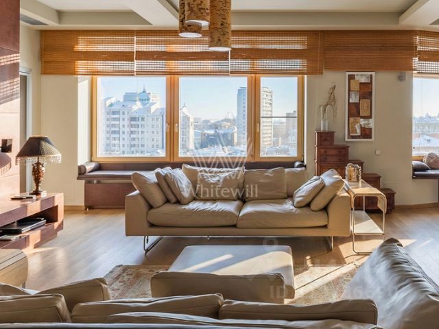 Квартира с дизайнерским ремонтом в светлых тонах, полностью меблирована. Благодаря высоте потолков 3,45 метров и панорамному остеклению пространство наполнено естественным светом и теплом. Интерьеры укомплектованы мебелью и техникой от ведущих производителей —Electrolux, AEG, Miele, Zanussi. Планировкой предусмотрены: кухня-гостиная-столовая, мастер-спальня с собственной ванной комнатой с окном, рабочая зона,гостевой санузел, гардеробная, балкон, холл. Окна ориентированы на юго-запад,открываются виды на город и благоустроенный двор. Санузлов два: один совмещённый с ванной и душевой кабиной, второй отдельный.