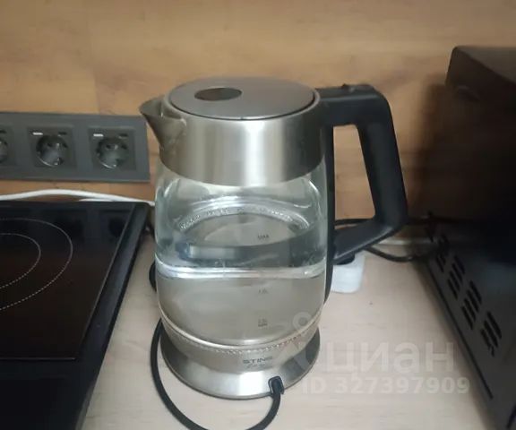 - На кухне стиральная машина с порошком, холодильник, газовая плита, микроволновка, новая посуда с приборами, фильтр для воды, чайник, чай, кофе, сахар, специи, подсолнечное масло, средство для мытья посуды.