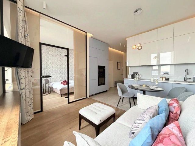 Просторный апартамент расположился на 63 этаже башни ОКО, он вмещает 2 полноценные спальни с собственными санузлами (одна из них с той самой панорамной ванной у окна, одна мысль о фото в которой сводит девушек с ума), просторную угловую гостиную для Ваших встреч и посиделок с друзьями и зону кухни-гостиной для welcome drink или кулинарных шедевров.