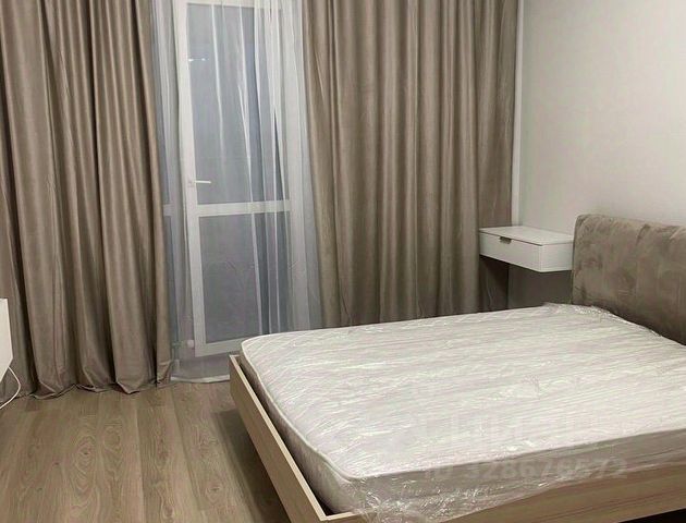 Спальня 1. с застекленной лоджией и системами хранения. Три уровня света. Свет по периметру регулируется с пульта. Шкаф, кровать двуспальная Vivent с системой хранения, две прикроватные тумбочки, шторы.