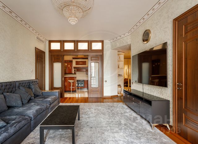 Состоит из холла, трех изолированных комнат, гостиной, зоны кухни, двух гардеробных, постирочной, двух лоджий, двух санузлов.