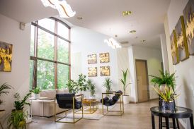 Большая лаунж-зона с панорамным видом города прекрасно подходит для комфортной индивидуальной работы и вечернего нетворкинга. Уникальные переговорные комнаты.