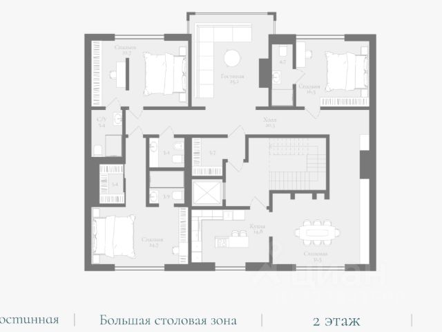 В доме расположены: на 1-ом этаже просторная светлая гостиная с камином, кухня-столовая, оснащенная современной бытовой техникой, кабинет, детская комната, вместительная гардеробная и в широкой прихожей коридора большой зеркальный шкаф-купе с антресолями, полноценный 1 сан. узел; на 2-ом этаже четыре спальные комнаты, 3 полноценные сан. узла, просторный холл - диванной зоны отдыха поделен на две части, одна из которых отмечена камином; на 3-м этаже пространство делится на две полноценные комнаты со спальным местом.