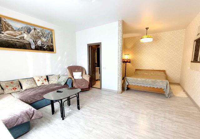 • гостиная с огромным раскладным диваном и большим телевизором со встроенной Алисой, федеральными каналами, кино и музыкой