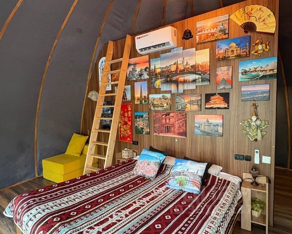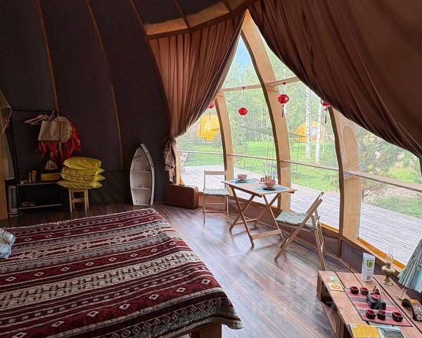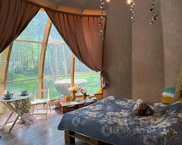 Глэмпинг "Багио" - это тихое уединенное место внутри заповедного леса всего в 100 км от Москвы. У нас на территории десять футуристических домиков - сфер, два семейных дома с 2-я спальнями и гостиной, а так же 3 дома для двоих, откуда открывается шикарный вид. Ближайшая станция — МЦД "Чисмена". В сферах и домах в распоряжении гостей кухня со всей необходимой техникой и посудой, кофемашина и капсулы, чай, фен, полотенце, постельное белье, косметика для душа, большая терраса с мангальной зоной, шезлонг. Для маленьких детей предоставляется кровать - манеж, а в семейном доме - двухъярусная кровать. Около каждой сферы и дома есть большая просторная терраса, мангал и зона отдыха. Все сферы имеют разный дизайн и находятся в 30-70 м друг от друга, чтобы гости чувствовали себя максимально уединенно. Также гости могут заняться спортом и взять в аренду инвентарь (в зависимости от времени года): санки, тюбинг, теннисные ракетки, бадминтон и фрисби. На ресепшене большой выбор настольных игр. На территории есть волейбольная площадка, брусья, турники, скамья для пресса, а также пруд с рыбой, банный чан и русская банька. У нас на территории открылся подогреваемый бассейн под открытым небом с шезлонгами и пляжным волейболом. Для самых активных гостей есть велосипеды! К нам едут, чтобы насладиться тишиной и природой. Из каждого панорамного окна открывается изумительный вид на лес, которым можно любоваться на террасе или прямо из кровати. Утро в "Багио" начинается с чашечки ароматного кофе под пение птиц, а вечером можно наблюдать за звездным небом. Ждем вас в гости! Футуристичная и просторная сфера, интерьер которой выполнен в классическом стиле: роскошный бархат, хрустальная люстра, массивные шторы и много золота. В сфере есть все необходимое для комфортного проживания: большая двуспальная кровать, журнальный столик и 2 мягких кресла, постельное белье, комплект полотенец для каждого гостя, два конвектора для холодной погоды и вентилятор для жаркой, плотные шторы. Полностью оборудованная кухня: кухонный гарнитур, холодильник, индукционная плита, электрический чайник. Набор посуды: тарелки, ложки, вилки, нож, чашки, стаканы, бокалы для вина и шампанского, кастрюля, сковорода. Ванная комната: туалет и душ с горячей водой, фен. Косметика для душа: шампунь, гель для душа, мыло, зубная паста и щётка. На террасе: два кресла, стол, мангальная зона.