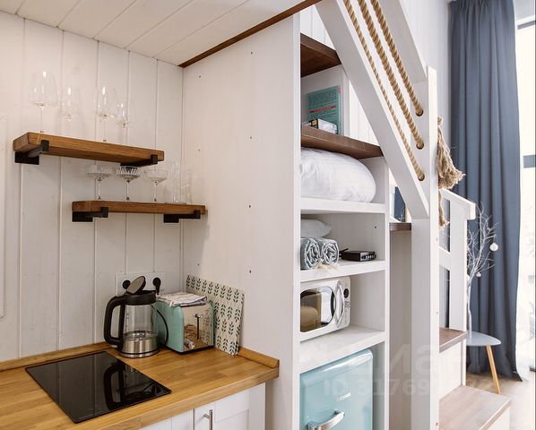индукционная плита, СВЧ печь с конвекцией, тостер, холодильник, вся необходимая посуда и приборы, электрический чайник, заварочник, чай, кофе и сахар, а также приборы для барбекю зоны, шампуры и решётка.