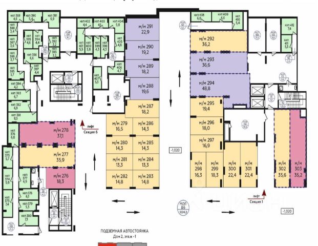 Семейное машино-место на 2 автомобиля площадью 36 кв. м. расположенное на -1 уровне. Рядом выход к лифтовой зоне 2 и 3 подъезда.