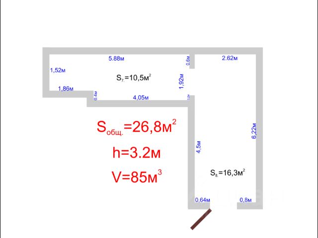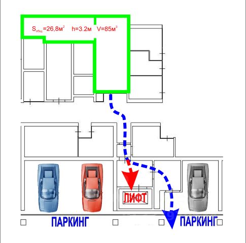 Площадь 26.8 м2, высота = 3.2 м, объем помещения ~ 85 м3 как у стандартной фуры.