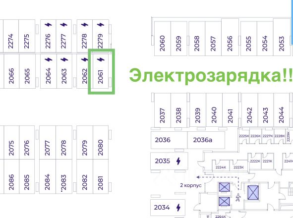 Машиноместо первое и ближайшее к лифтам корпуса 2. Стандартная площадь 13,8 м² на -1 этаже.