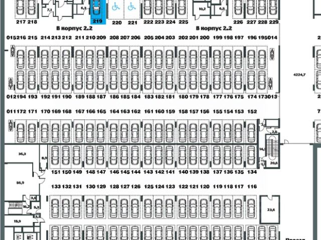 Широкое (около 3м) обособленное машино-место 16 м2 на м -1 этаже с удобным заездом и посадкой. На плане 219 примыкает к подъезду 2 (2.2.1). Стоимость включает в себя эксплуатацию и коммунальные платежи. Официальный договор. Возможна установка шкафа.