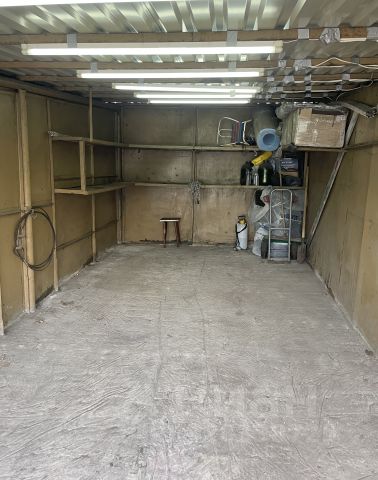 Просторный гараж. Бетонный пол. Электричество. Двухъярусные полки по трем сторонам.