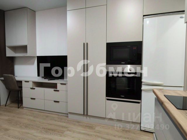 Кухонный гарнитур , встроенной техникой (ЭЛЕКТРИЧЕСКАЯ варочная панель и духовой шкаф, микроволновая печь, холодильник ) обеденный стол с мягкими стульями.