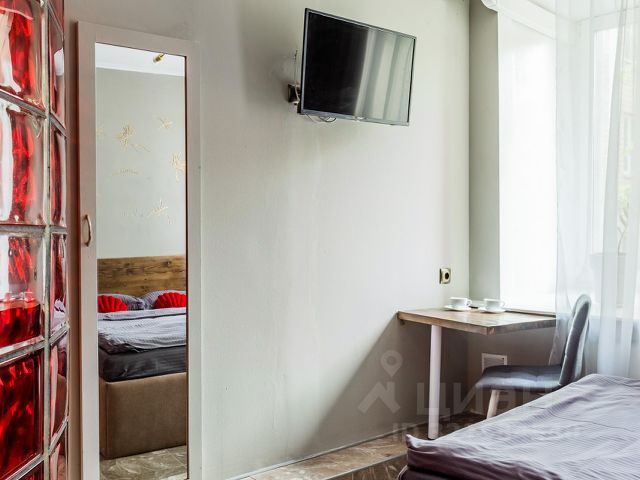 одна двуспальная кровать, телевизор, рабочая зона, шкаф для белья, большое зеркало.