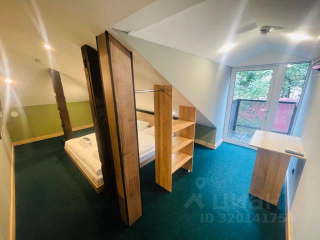 Двухъярусная кровать, нижний ярус-двуспальная кровать, верхний ярус-односпальная. В номере имеется тумба, вешалка для одежды, зеркало, прикроватные полочки, розетки, индивидуальное освещение у каждого яруса кровати.