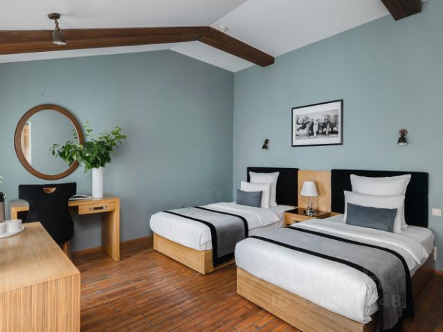 Однокомнатные номера в элегантном стиле с двуспальной кроватью и мебельным гарнитуром.