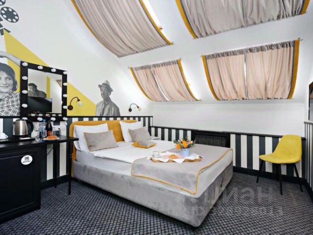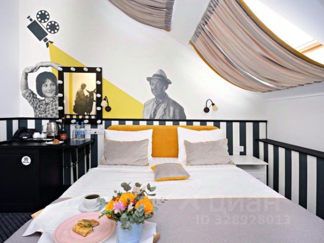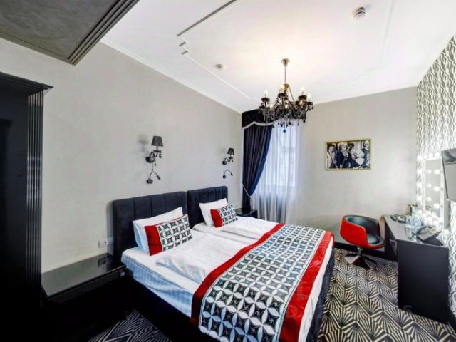 Четырехзвездочный арт-отель в центре Москвы, в микрорайоне Патриаршие Пруды, в 2 км от Красной площади. Рядом находятся музей современной истории России, мемориальный музей "Творческая мастерская С. Т. Коненкова", Нарышкинский сквер, Московский художественный академический театр имени М. Горького и Правительство Москвы. Расстояние до аэропорта Шереметьево составляет 34 км, а до Белорусского железнодорожного вокзала 2 км. Отлично подходит как для туристической, так и для деловой поездки. Для бронирования предлагаются номера различных категорий: Стандарт, Улучшенный, Полулюкс и Люкс. Номера оснащены комфортабельной мебелью, телевизором, холодильником, сейфом, чайным набором, удобной рабочей зоной и собственной ванной комнатой с туалетно-косметическими принадлежностями. Ежедневно в ресторане сервируется завтрак, на котором подают холодные закуски, салаты, горячие блюда, овощи, десерты и напитки. Гости могут воспользоваться услугой трансфера. Личный автомобиль можно оставить на парковке отеля. Просторный четырехместный номер с видом на старинные московские дома. Дизайнерский интерьер позволит погрузиться в мир театра и кино, отвлечься и комфортно отдохнуть.