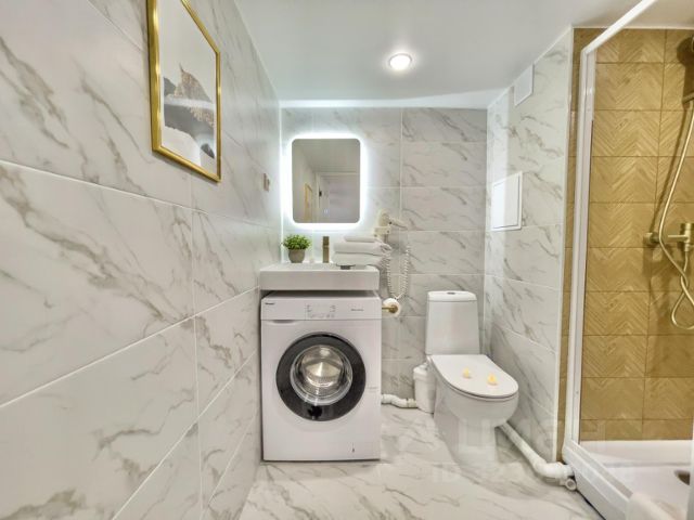 Апартаменты расположены на втором этаже ЖК Водный, в третьем корпусе, не имеют балконов. Номер спроектирован в виде студии, спальная зона объединена с кухонной. В номере отдельно выделена уютная обеденная зона. Санузел совмещенный. Дизайн интерьера выполнен в современном стиле минимализм в бежевых, молочных, белых и горчичных тонах. Высокие потолки в помещении зрительно увеличивают пространство и создают уютную обстановку. Напольное покрытие номера ламинат, ванная комната полностью отделана плиткой. В помещении располагается широкая кровать "Queen size", укомплектованная ортопедическим матрасом и гипоаллергенным постельным бельем. Гости найдут в номере компактный, но вместительный шкаф для одежды. Яркое освещение в апартаментах обеспечивают люстра и подвесные светильники над кроватью.