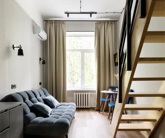 Двухуровневая просторная Студия 15 кв м, с высоким потолком и спальней на втором уровне номера. Для удобства гостей в номере своя ванная комната, мини-кухня со всей необходимой техникой и набором посуды, кондиционер, гостиная зона с раскладным диваном и электронные замки для полностью бесконтактного заселения.