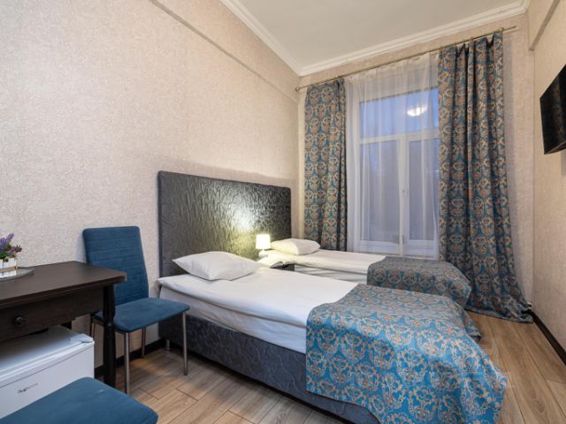 В номере есть большая плазменная панель, сплит-система, большая двуспальная кровать, прикроватные тумбочки, зона отдыха из двух стульев и стола, санузел с душевой кабиной, комплект полотенец, туалетные и ванные принадлежности, а также фен.