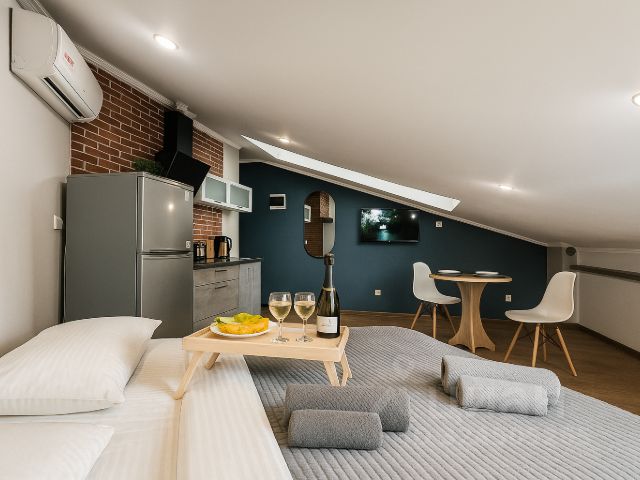 Дубровка "Standard" 16 м2, 2 человека Уютный номер-студия с мансардным окошком и всем необходимым для комфортного проживания. Обращаем ваше внимание, что апартаменты находятся на 6-ом этаже и в здании нет лифта. Вид комнаты может отличаться от представленного варианта на фото.