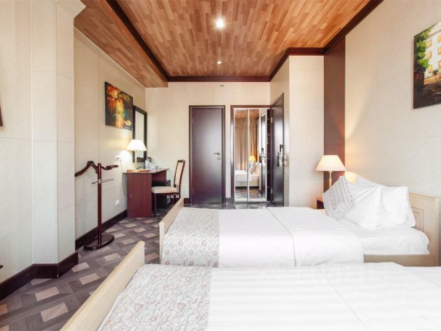 Двухместный номер категории "Стандарт" с одной двуспальной (160см*200см либо 180см*200см) или двумя раздельными кроватями ( 90см*200см либо 120см*200см) прекрасный вариант для деловой поездки или отдыха пары. Небольшой, но очень комфортный номер отличается стильным интерьером в теплых тонах, которые лишь добавляют уюта, расслабляют и настраивают на отдых. Плазменная панель и доступ к интерактивному спутниковому телевидению разнообразят досуг. Если в поездке вам нужно поработать — в вашем распоряжении удобный рабочий стол и вы