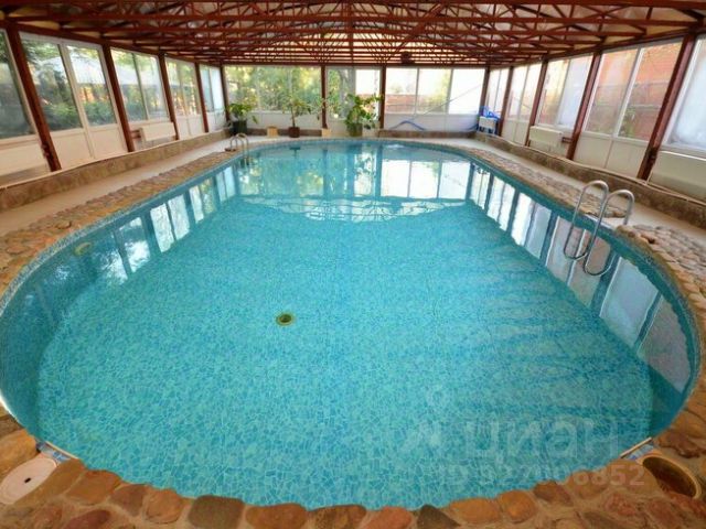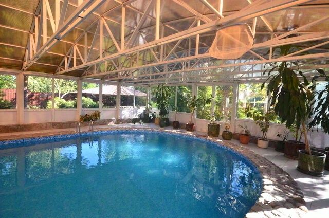 В отдельно стоящем здание расположена электрическая сауна ( парилка на 6 человек), бассейн ( 12на5м, глубина 3м) с подогревом до 24 градусов.