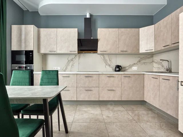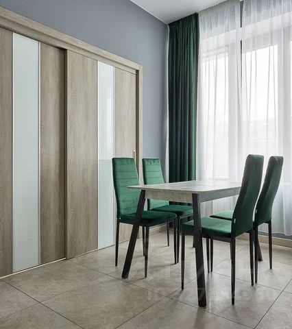 Глянцевая кухня спрятана в глубине гостиной, аккуратно скрывая готовящийся на плите завтрак. Мягкий серый диван, уютные подушки и плед, круглый стол и кремовые кресла продлевают негу и тишину. Воздух наполняется ароматом миндальной каши с печёными яблоками.