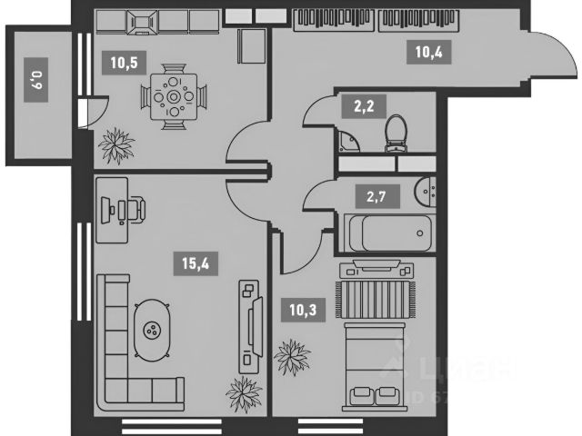 Планировка: кухня-гостиная с обеденной зоной, 2 спальни, большая гардеробная, ванная комната со всеми удобствами, санузел с душевой.
