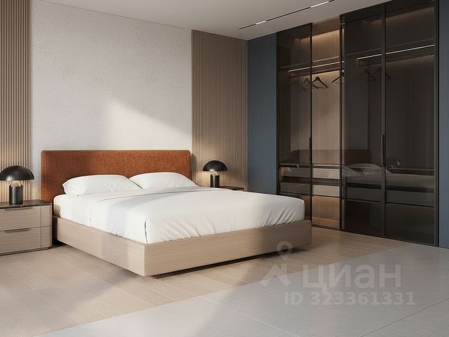 Спальня: светлая, с двуспальной кроватью, комодом, вместительными гардеробными шкафами и рабочим местом.