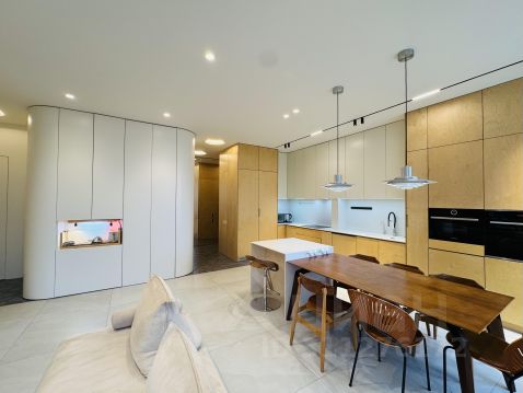 Планировочное решение объекта включает в себя архитектурное решение - объединённую кухню столовую гостиную с выделенными зонами отдыха и полноценную кухню с премиальной встроенной техникой "Kuppersberg" (холодильник, посудомоечная машина, духовой шкаф, индукционная плита, вытяжка) и обеденной группой, различными вариантами освещения на любой случай Вашей жизни, при входе в квартиру предусмотрен холл с гардеробным шкафом за зеркальными дверями, оборудованная необходимой мебелью гостевая комната или кабинет, гостевой туалет, в противоположной от входа части квартиры расположена основная спальня, рядом находится ванная комната укомплектованная всей необходимой сантехникой, стиральной машиной, и просторной душевой.