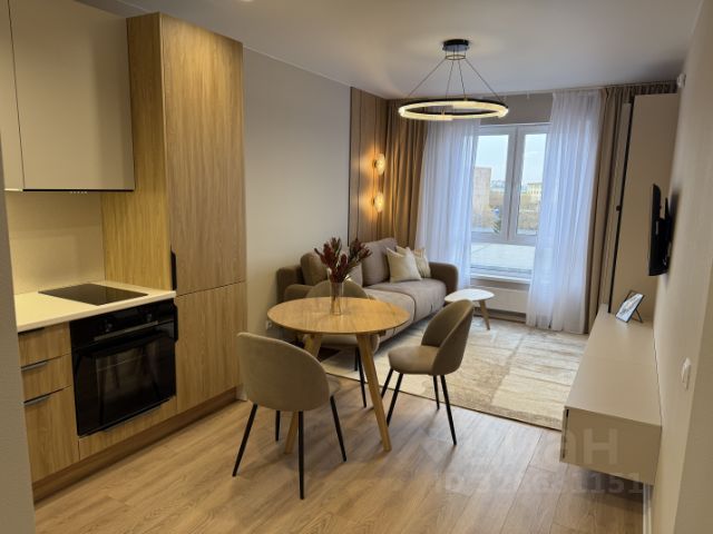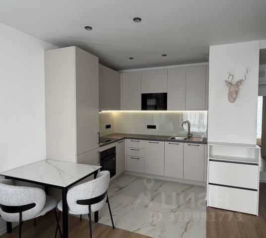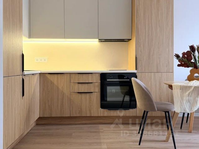 В кухонной зоне кухонная мебель 7 погонных метров с встроенными плитой, микроволновкой, духовкой, ПММ (вся техника Kuppersberg), холодильником Liebherr, измельчителем бытовых отходов, сенсорной мусоркой. Деревянный раздвижной стол с 6 стульями.