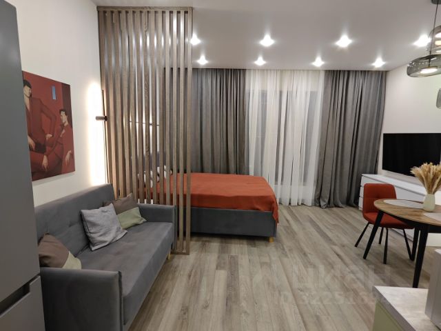 Формат студии с четким зонированием помещения на прихожую, кухонную и спальную/рабочую зону.