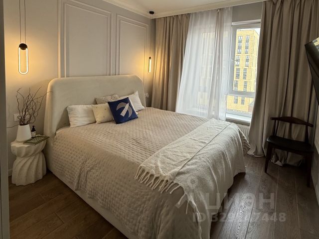 В спальне большая двуспальная кровать с тумбами, из окна открывается фронтальный вид на воды Москвы-реки. Есть несколько комплектов сатинового постельного белья, 2 одеяла, 4 подушки. Спальня декорирована приятным текстилем.