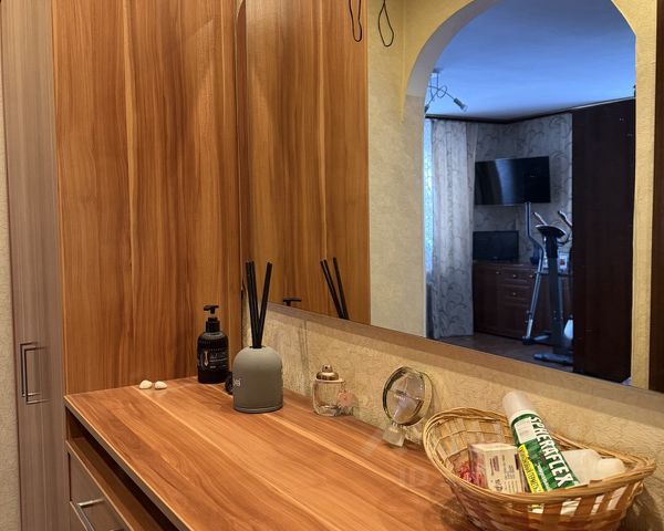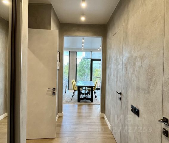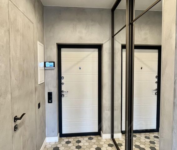 Просторная прихожая с парящим зеркалом в потолок встречает легкостью, вместительный встроенный шкаф и большой санузел с ванной добавляют удобства.