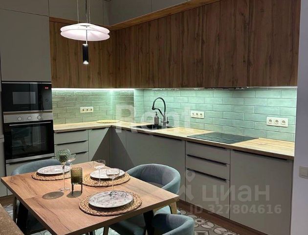 Шикарная встроенная кухня оборудована всем необходимым: большое количество ящиков для хранения, дополнительная подсветка, дизайнерский обеденный стол из натурального дерева, и удобные стулья в светлых тонах к нему.