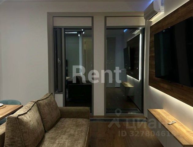 - гостиная с раскладным диваном, креслом, большим комодом и телевизором. К гостиной примыкает большой балкон с панорамным остеклением. При желании можно оборудовать рабочее место или лаунж зону.