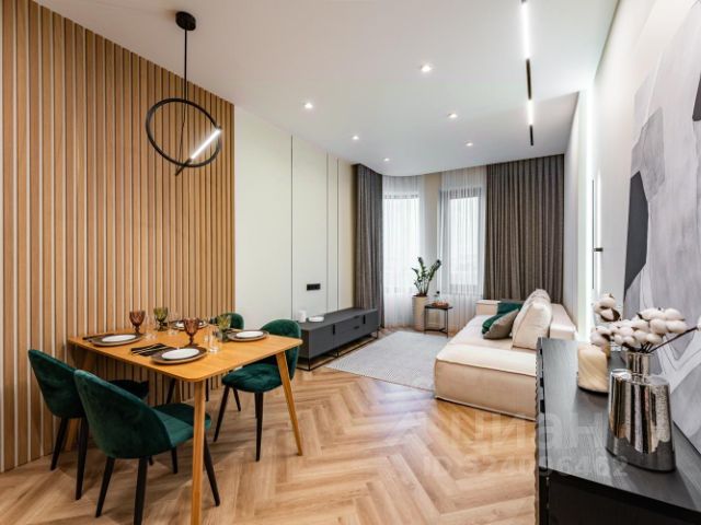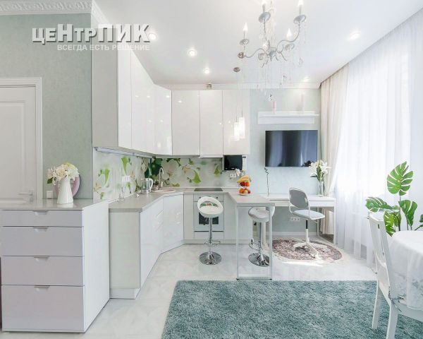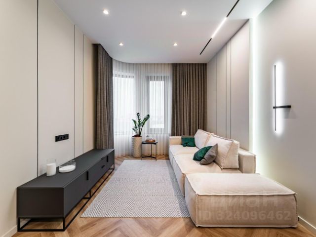 В квартире сделан дизайнерский ремонт, что позволило сделать не только просторный зал, переходящий в кухню, но и разместить вместительную гардеробную, вполне большую ванную, а также отдельную постирочную.