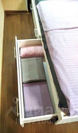 Спальня, отделена шторами блэкаут пыльно-розового цвета: двуспальная кровать с удобным изголовьем-полкой для самого необходимого и ящиками для постельного белья, ортопедический качественный матрас высотой 20 см, бра с каждой стороны с функциями изолированного выключения, ночника и подзарядки вашего устройства от usb (для чего также есть настенные органайзеры).