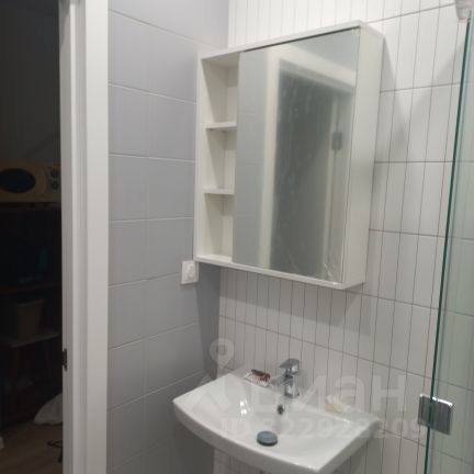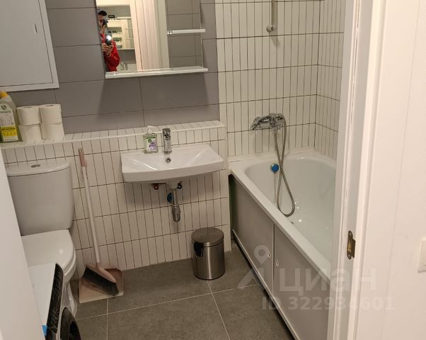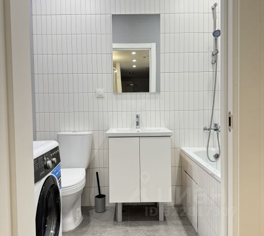 В коридоре открытая вешалка для одежды, пуфик, пылесос, WI-Fi. В ванной комнате установлена ванна, раковина с тумбой, зеркало, унитаз, стиральная машинка.